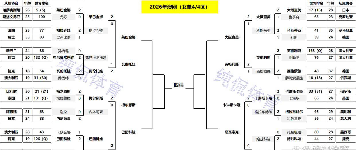 女单方面,八强出现了头号种子白俄罗斯重炮萨巴伦卡,美国名将高芙,乌克兰名将斯维托丽娜,以及排名29位的美国选手伊娃-约维奇。萨巴伦卡过去三个澳网均闯入决赛,拥有2023年和2024年的两次冠军头衔,仅在2025年决赛遗憾负于美国选手凯斯,无缘三连冠。目前已确定的女单四分之一决赛对阵组合为:萨巴伦卡对阵伊娃-约维奇,高芙碰斯维托丽娜。若萨巴伦卡和高芙均顺利晋级,半决赛势必上演焦点大战,吸引众多球迷期待。