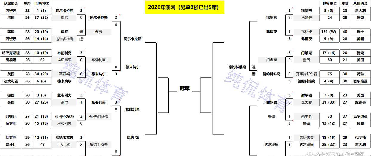 目前,男单八强名单已基本确认:包括头号种子、西班牙名将阿尔卡拉斯;德国名将兹维列夫(3号种子);塞尔维亚巨星德约科维奇(4号种子);澳大利亚本土希望德米纳尔(6号种子);以及25号种子美国选手勒纳-钱。值得关注的是,阿尔卡拉斯状态火热,迄今为止四场比赛全部零封对手,没有丢过一盘,因此被视为夺冠最大热门。如果成功摘冠,他将成为公开赛时代最年轻的全满贯冠军得主。